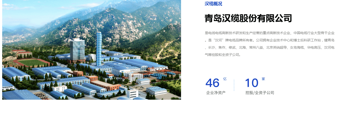 青島漢纜股份有限公司是從事電線電纜及相關產品技術研發和生產經營的國家高新技術企業。公司成立于1982年,總資產40億元,現有員工3000余人,企業年銷售收入46億元。2010年,公司在深圳證交所上市(股票簡稱:漢纜股份;股票代碼:002498)。漢纜在行業通過ISO9001、ISO14001、OHSAS18001三大體系認證,并獲中國電能認證和KEMA、DNV、UL等認證。